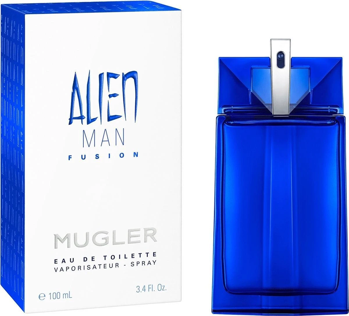 De flacon van Alien Man Fusion is saffierblauw met glanzende weerkaatsingen. Een edelsteen die zo fel blauw kleurt, dat het haast bovennatuurlijk oogt.