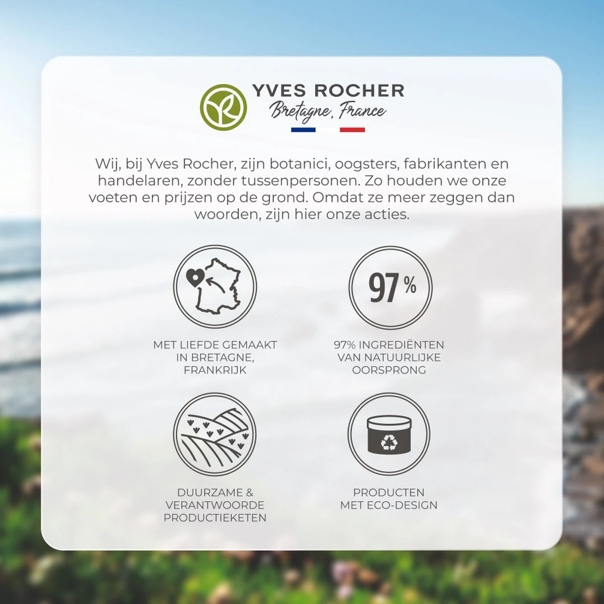 Yves Rocher, het Franse cosmeticamerk werd opgericht in 1959. De fascinatie van het merk voor de natuur en de kracht van planten ligt aan de oorsprong van het merk dat vanuit Bretagne de wereld veroverde. Elke dag zet Yves Rocher zich in voor de schoonheid van vrouwen en de natuur.